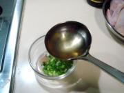 捞出后,拎起鸡腿的线绳,用勺舀沸汤浇入鸡的腹中,浇三至五勺。