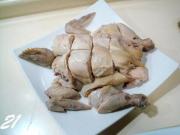 先把鸡头和不好的部位,如背骨,斩件码盘垫底。