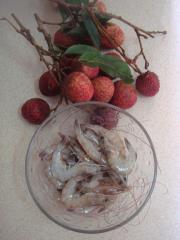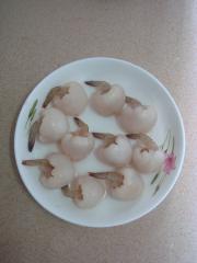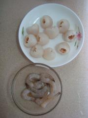 荔枝去核,放淡盐水中浸泡片刻捞出,虾去头留尾去虾肠,用1/3茶匙盐、1/2茶匙鸡精、1茶匙料酒、5ml蛋清上浆,腌制10分钟。