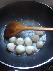 然后把荔枝虾球虾身朝下放入锅里,倒入上汤焖都一会。