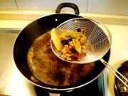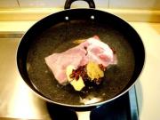 由于用油煎肉的皮面时很容易爆,为了避免造成不必要的烫伤,可在下入肉方后立即盖上锅盖。