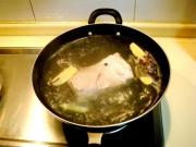 锅上火注入清水烧开,里面放入葱、姜、八角和一片香叶。