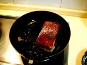 温油时便可把肉方下入锅中,只煎肉方的带皮的一面。