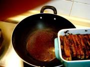 取出蒸好的肉,把汤汁从蒸盘中滗入炒勺里烧开。