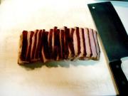 在煮梅菜的空闲时间里,可把晾凉的肉方用刀切片。