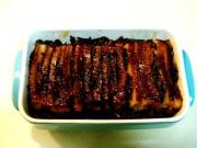 把切好的五花肉片整齐的码放到梅菜上面,再取剩余梅菜的二分之一夹到每片肉片的之间,数量不宜多夹匀即可,最后把剩下的梅菜塞放到肉的两边。
