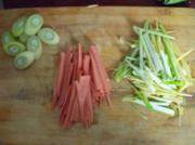 火腿葱姜切丝,留下一段葱切片。