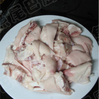 猪脚洗干净,切成块,焯水,取出,用清水冲去浮沫。