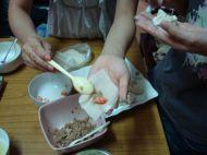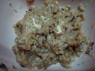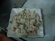 把五花肉和香茹末剁成肉馅,加油,盐(少量胡椒粉或料酒)掩好备用
