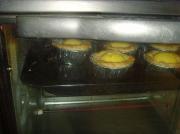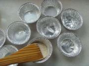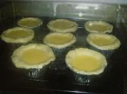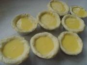将松弛好的面卷用刀切成片,擀成面皮放入模具内轻压,使之贴合;捏好的塔皮里装上蛋塔水(装七八分满即可)。