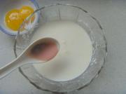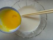 将打散的蛋黄倒入奶浆中,调匀即为挞水。