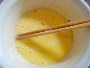 鸡蛋磕到碗里,调匀。
