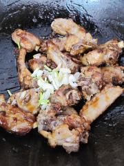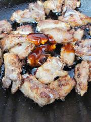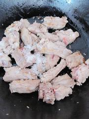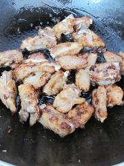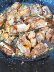 煎排骨稍干出油后,放白糖炒糖色。