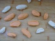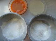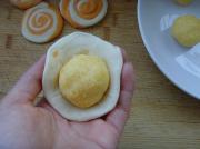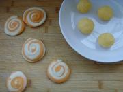 蛋黄加入糖、黄油、栗粉、奶粉混合调匀,调入少许胡萝卜汁做成馅料。