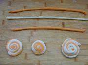 来回揉搓成长条,将三根两色面条螺旋盘起成剂子。