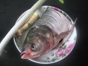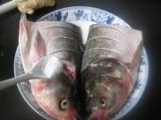 把鱼对剖,并在鱼身横切几刀,里外用盐抹上。