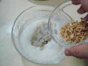 把蛋糊、虾仁、花生碎混合拌匀。