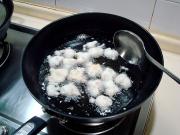 此时油温烧至3-4成热时挤入虾糊,用温油慢炸,在炸的过程中,要用手勺不断的来回搅动,使其上色均匀。