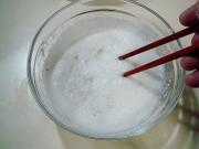 糊的硬度,以能在中间戳一双筷子竖立不倒为标准,然后把蛋清糊倒入碗中,里面加入干淀粉拌匀。
