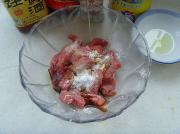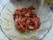 牛柳中依序加入胡椒粉、淀粉、黄酒、老抽、姜汁搅拌均匀。