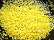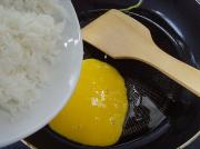 锅置火上放少许油烧至3成热倒入蛋液,蛋液快凝固立即倒入米饭。