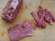牛柳洗净先顺纹路切厚片,再逆纹路切条。