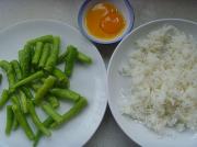 杭椒洗净,去两头切成段;鸡蛋取蛋黄加少许盐打散;米饭打散备用。