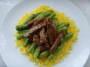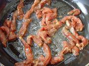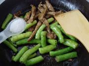 加入牛柳、少许盐、鸡精,大火快速炒匀出锅。