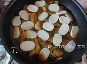 锅里汤汁耗去三分之一时,放半勺糖,倒入切好的年糕片。让年糕尽量浸在汤汁里,再盖上锅盖,用中小慢炖一小会。