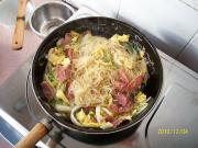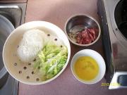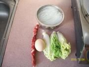 米粉沥干、白菜切丝、腊肠切片、鸡蛋打散。