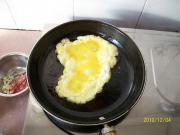 锅里下多点油,将鸡蛋炒好,铲块盛出备用。