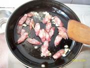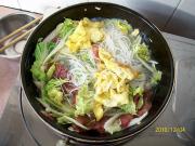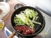 腊肠微卷透明时放入白菜丝。