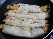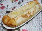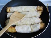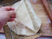 将饼卷起卷紧,收口朝下放入锅中。用铲子使劲压。