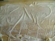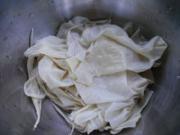 油皮捞出,轻轻挤出水分,将两张油皮相叠放在砧板上。