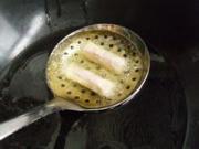 锅内烧油至五成热,将油皮卷用漏勺轻轻放入锅中炸两分钟。