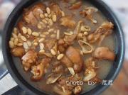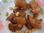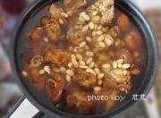 把泡发好的黄豆放入,再倒入清水没过猪蹄。盖上锅盖中火20分钟。中途记得开盖炒匀。