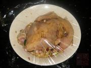 用保鲜纸将鸡蒙起来,放冰箱腌制一个晚上。