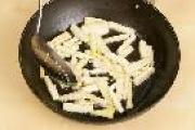 锅中倒入足量油可以完全没过春笋,待烧到7成热后放入春笋以中火不断翻炒,既要把水分炒出,又不要炒干、糊。