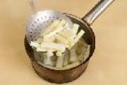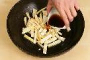 春笋去笋皮,切手指粗细的条。然后将春笋放入热水中煮约2~3分钟捞出,浸泡冷水10分钟,可以去涩味,然后沥水备用。当然也有的春笋一点都不涩,省略此步骤也无妨。