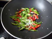 锅里重新倒油,放入蒜末爆香,放入杭椒翻炒均匀。