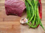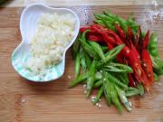 杭椒和红尖椒切斜片,蒜切蒜末。