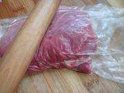 牛肉去除筋膜,装入保鲜袋,用木棍轻轻敲打,这样可以使牛肉更滑嫩。