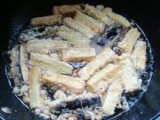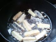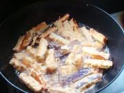 将锅内油烧至七成热,将茄条放入锅内再炸一次。