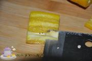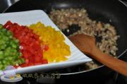青、红、黄椒,一律将两头切掉,将里面的白色部分切除,然后切丁备用。