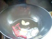 热锅后,放入麻油烧热,放入姜片、辣椒煸炒出香味。