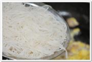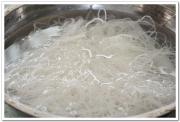 蛋液凝固后,将泡好的粉丝下锅。