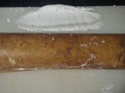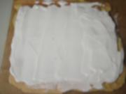 然后将蛋糕覆盖在油布上,抹上奶油 要抹的均匀。(不要抹的太厚 不然卷的时候都会挤出来的)