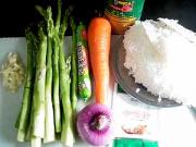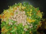 最后倒入玉米粒 芦笋丁和蘑菇香肠丁倒入锅中。
