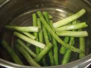 将芦笋切两段放到沸盐水中焯一下。