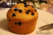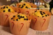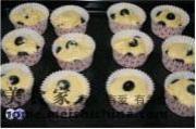 然后把蓝莓,搅拌好的材料用勺子分量平均装入马芬纸杯中。
